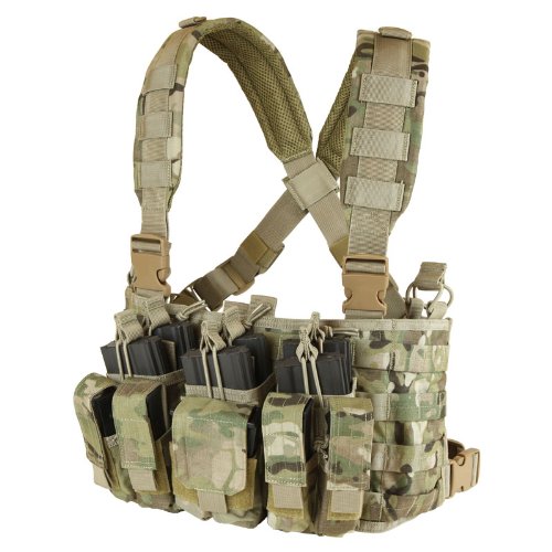 - Genuine Crye Precision Multicam material, sewn in foreign country. -chest rig comes with three BUILT IN stackerKangaroo type mag pouch, will hold six M4 mag and six pistol mag. -Swivel Lockster - Swivel Push-Button release buckle. -Padded cross-back shoulder strap with webbing and D-ring. -Additional mesh pocket on the back. -Two open-top mag pouch. (one on each side) - One size fits most